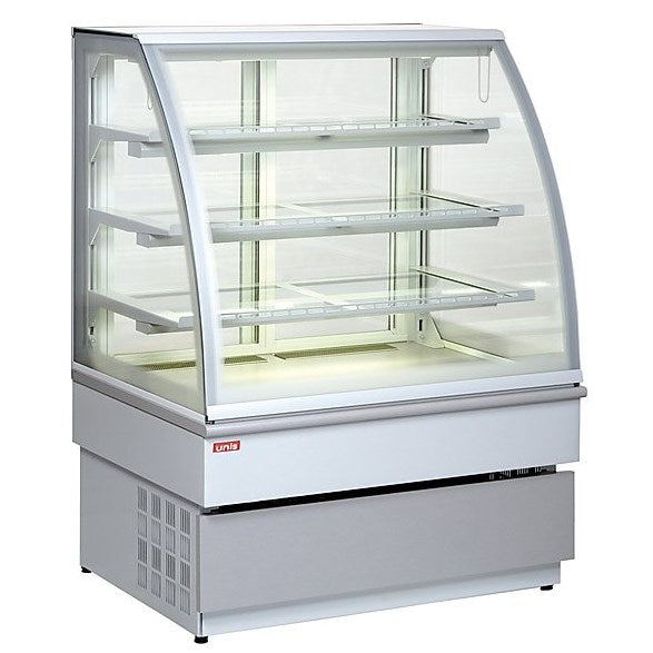 Elegant konditorimonter för konditorivaror med böjt dubbelt frontglas som ger optimal exponering mot kund, samt praktiska glasskjutdörrar på personalsidan.